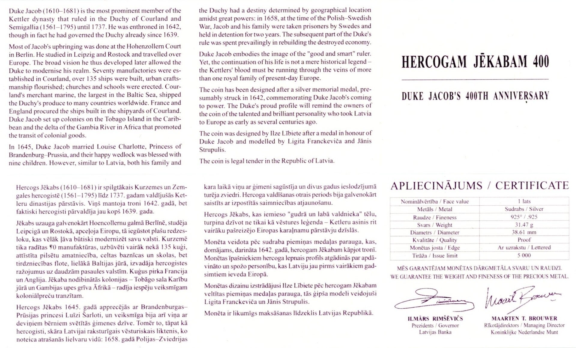 Сертификат для монеты 1 lats 2010 "Hercogam Jēkabam 400" - 7 €