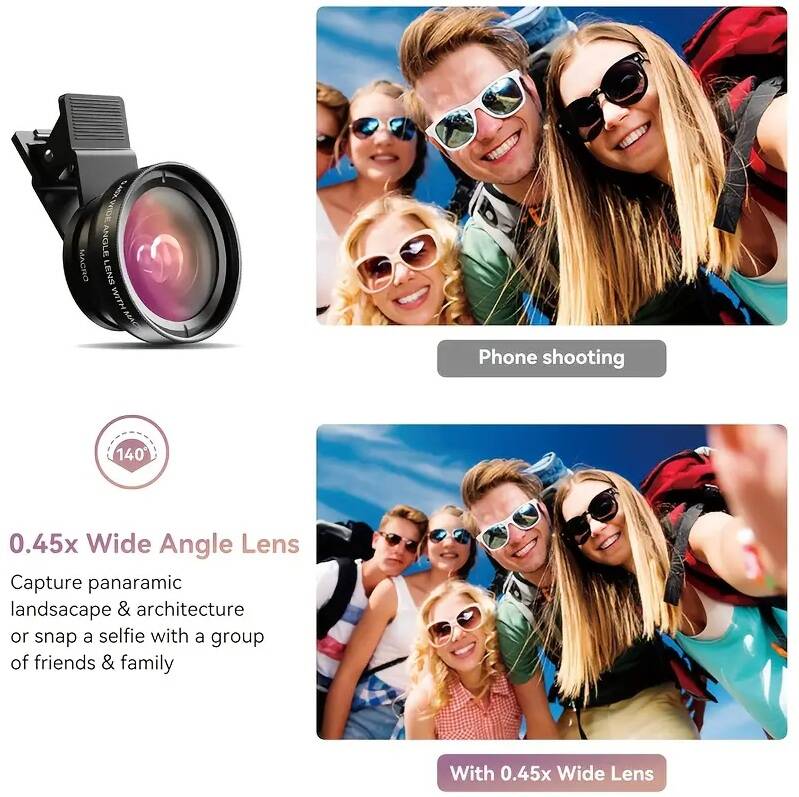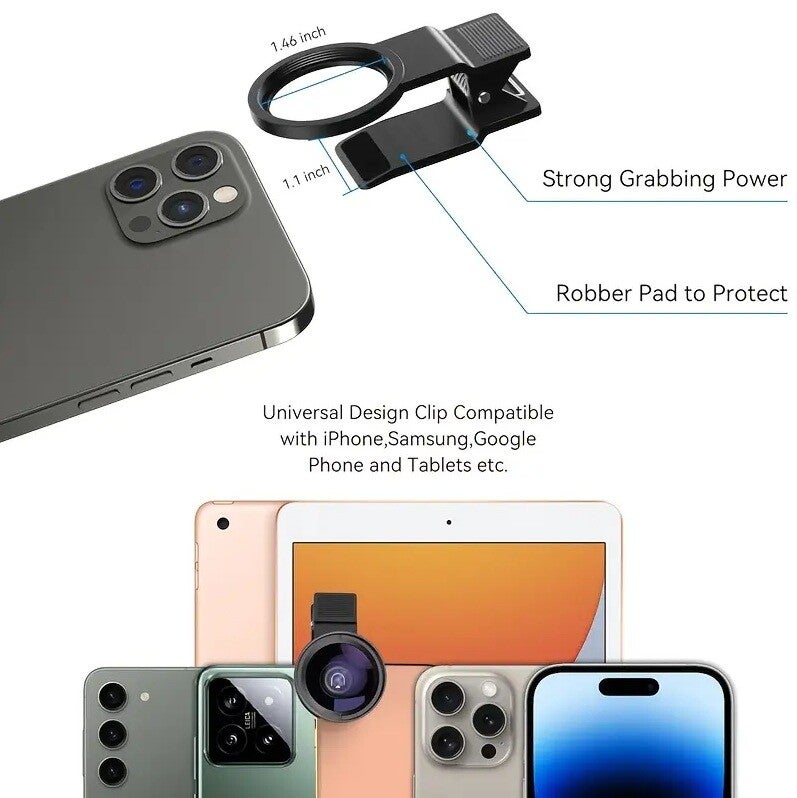 Комплект для смартфона, состоящий из клипсы и двух линз. Зажимы клипсы прорезинены, чтобы не поцарапать телефон. Макро-линза с увеличением 12.5x может использоваться вместе с широкоугольной линзой с коэффициентом увеличения 0.45x или отдельно. Также в комплект входит защитный чехол.