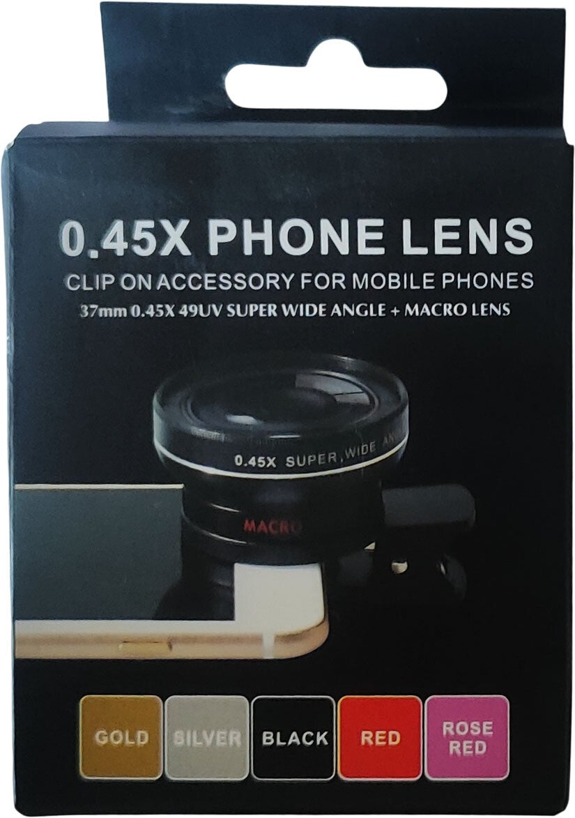 A smartphone lens kit consisting of a clip and two lenses. The clip is rubberized to prevent scratching the phone. The 12.5x macro lens can be used together with the 0.45x wide-angle lens or separately. A protective case is also included in the set.
