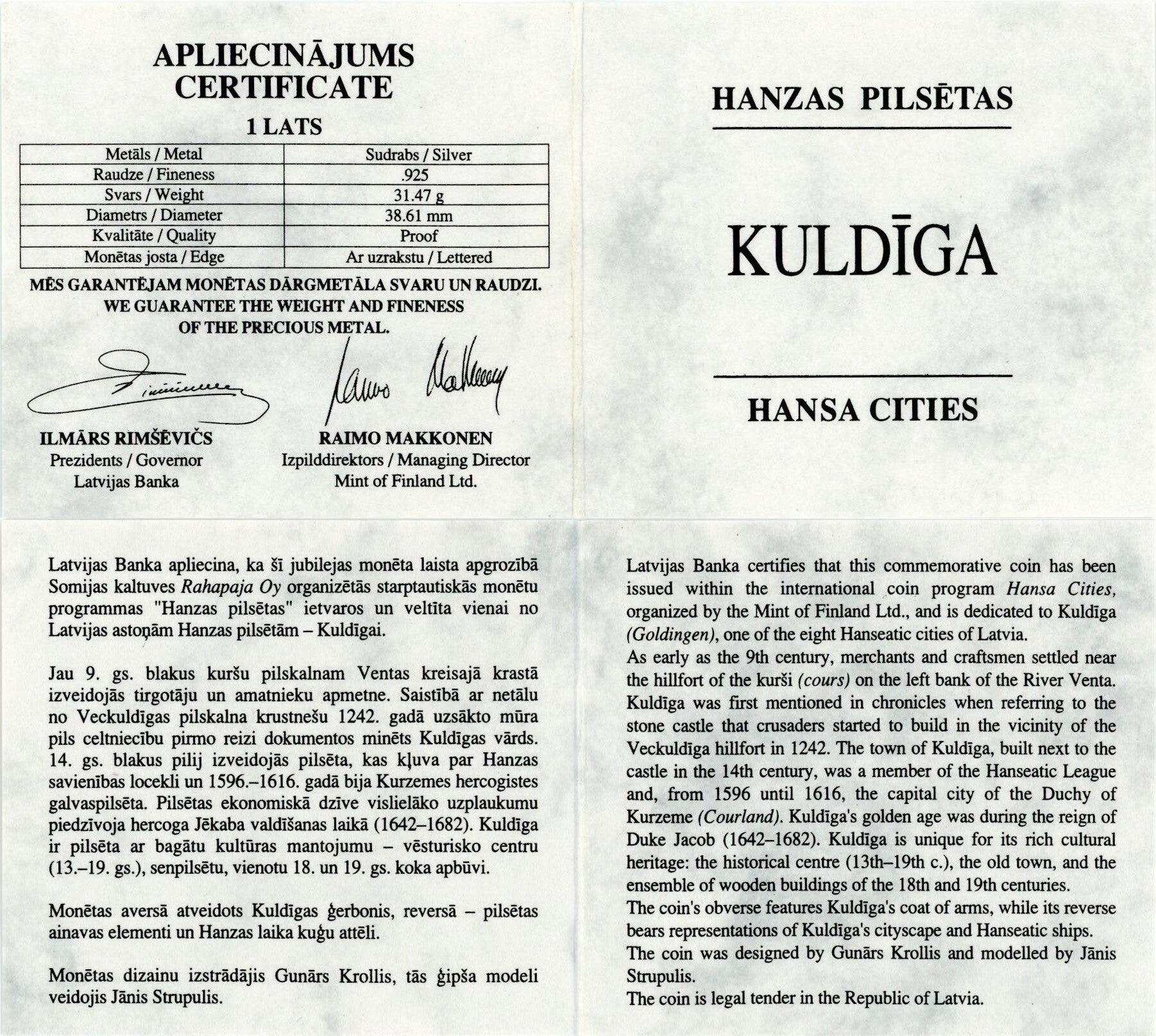 Сертификат для монеты 1 lats 2002 "Kuldīga" - 10 €