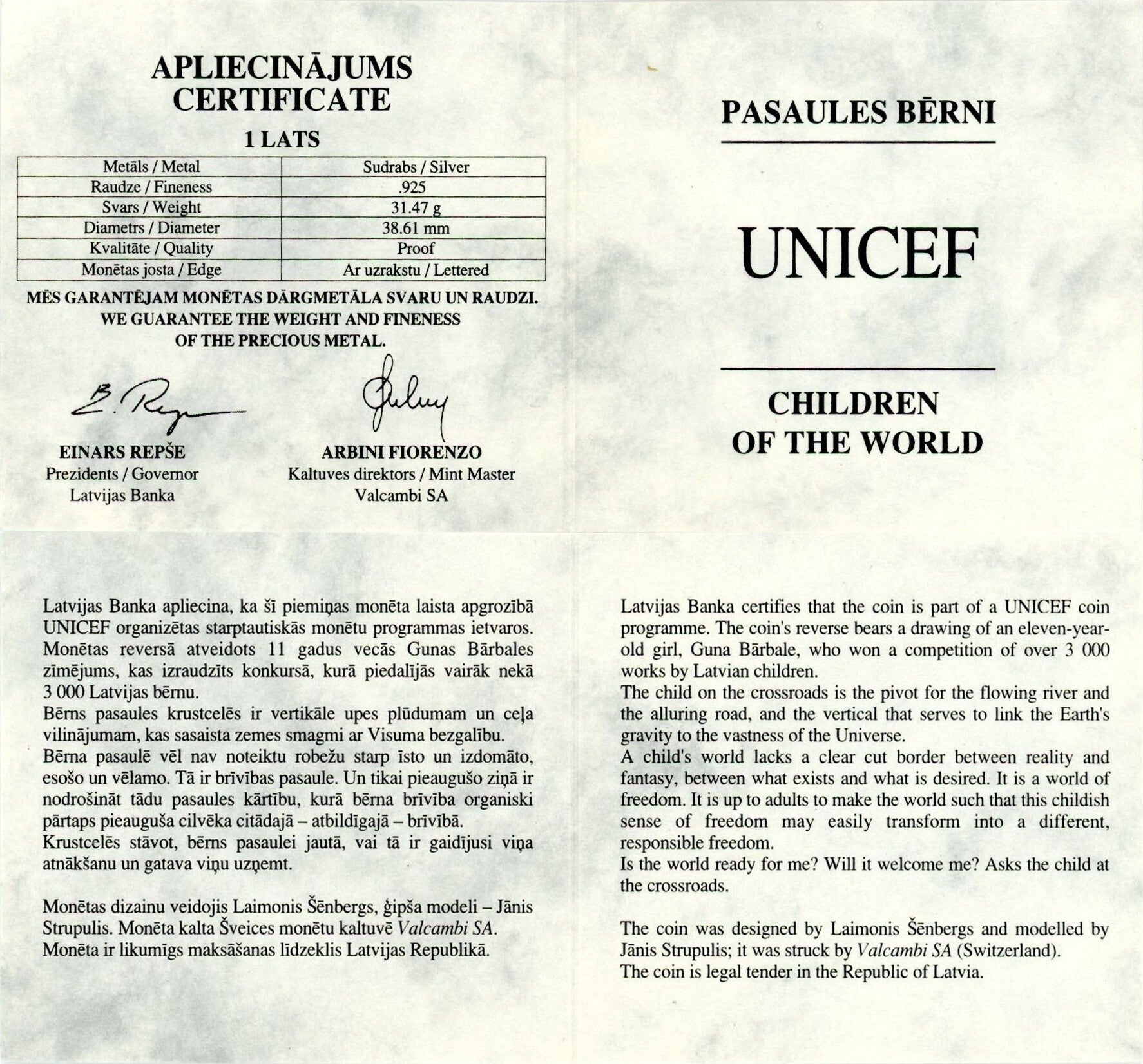 Сертификат для монеты 1 lats 2000 "UNICEF "Pasaules bērniem"" - 10 €