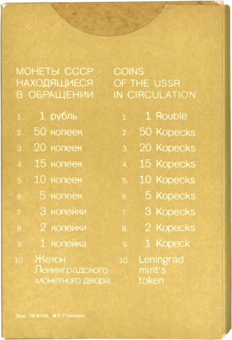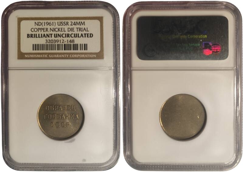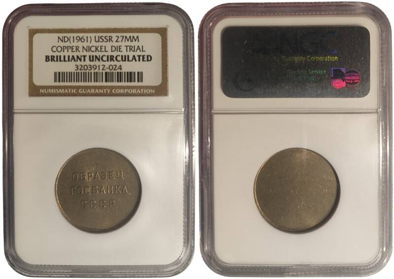 Specimens issued by the State Bank of the USSR match the regular circulation coins of the 1961 series in all parameters — metal, diameter, weight, and edge type. One side bears the inscription “ОБРАЗЕЦ ГОСБАНКА СССР” (“SPECIMEN OF THE STATE BANK OF THE USSR”), while the other side is blank. Both sides feature a raised rim along the edge. The “1 ruble” and “50 kopeks” specimens have a smooth edge, while all other denominations have a reeded edge. All denominations are considered rare. There are isolated reports of lower-denomination specimens being found in circulation.